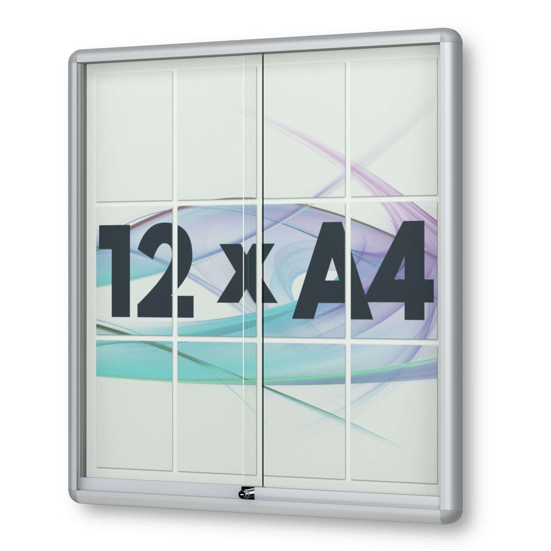 Vitrinen.de ➤ "12 x DIN A4 Schaukasten Moveo - "die Schulvitrine" - 50 mm Bautiefe - mit Brandschutzklasse A1 - Rollengelagerte Schiebetüren✓ abschließbar✓ ESG-Sicherheitsglas✓"